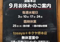 皆様 いつもうどん土佐屋をご愛顧いただき誠にありがとうございます。 10月の深井店の営業予定日は下記になります。 10月の深井店は、通常通り水曜定休日 にお休みをいただきます。ご不便をおかけいたしますが、ご理解のほどよろしくお願いいたします。 新店舗のtosaya+キクヤ堺本店は休みなく営業しております。 夏が終わり徐々に肌寒い季節がきました。風などに気を付けて、温かいおうどんで寒さに備えていきましょう! 皆さまのご来店お待ちしております。