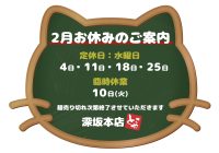 2月の深井店は、月曜・火曜の夜の部と水曜日 定休日 にお休みをいただきます。